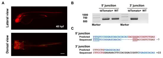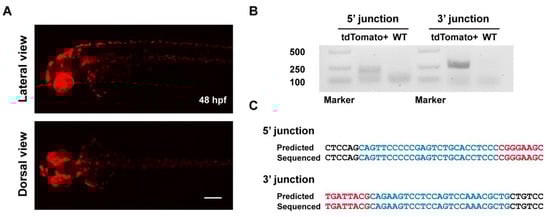 We further sought to explore whether we could use ErCas12a rather than Cas9 for donor in vivo linearization to simplify the injection system. Since the tbx2b Cas9 R295H donor already contains the tbx2b ErCas12a target site as part of its downstream supplementary intronic sequence, we directly used this donor for our experiment. Curiously, after injection of ErCas12a mRNA, tbx2b pre-crRNA, and the tbx2b Cas9 R295H donor followed by heatshock, no tdTomato expression was observed in the embryos, and genomic integration was also not detected by junction PCR (data not shown). The addition of Cas9 mRNA and lamgolden gRNA into the above injection system showed no improvement. Inspired by our previous findings on Cas9-mediated donor in vivo linearization [], we adopted LiCl precipitation in place of ethanol precipitation to obtain LiCl-purified tbx2b pre-crRNA, and co-injected it with ErCas12a mRNA and the tbx2b Cas9 R295H donor (Figure S3A). After heatshock, 51.4% (57/111) of embryos showed mosaic red fluorescence, among which 19 embryos (17.1%) displayed a broad expression pattern (Figure S3B). Thus, we could achieve simultaneous genome cleavage and donor linearization with ErCas12a to induce NHEJ-mediated large DNA fragment knockin with a simple injection system.