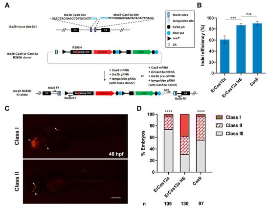In zebrafish (Danio rerio), however, while the use of Streptococcus pyogenes Cas9 nuclease (hereafter referred to as Cas9) is as convenient, efficient, and versatile as in ex vivo systems [,,,,,,,,], the application of Cas12a is still limited [,,]. Cas12a generally showed poor editing efficiency in zebrafish, and optimal mutagenesis required injection of AsCas12a/crRNA or LbCas12a/crRNA in the form of ribonucleoproteins (RNPs) followed by heatshock for four hours, which may damage embryos [,]. Recently, Cas12a identified from Eubacterium rectale (ErCas12a, also known as MAD7 nuclease), was reported to induce efficient mutagenesis when injected as mRNA in zebrafish embryos, but also requires heatshock treatment []. Interestingly, the integration of large DNA fragments into the zebrafish genome has been frequently reported with the use of Cas9 in the form of mRNA [,,,,,,], while, to date, no studies have reported successful NEHJ- or MMEJ-mediated knockin in zebrafish using the highly efficient RNP form of Cas9 [,,]. Therefore, we hypothesized that the mRNA-active ErCas12a could be an ideal tool for large fragment knockin in zebrafish, particularly for homology-based approaches, which might be facilitated by the staggered DSBs. In addition, its different target site selection criteria compared with Cas9 should greatly increase the targetable range as well as flexibility for the experimental design to achieve large fragment integration, especially for T-rich sequences such as introns.