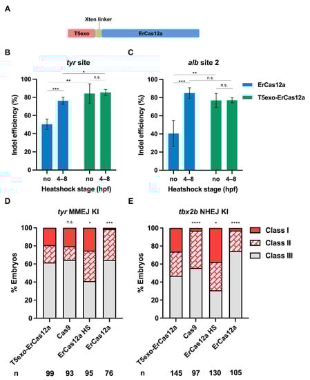 Considering that ErCas12a generates 5′ protruding sticky ends at the site of the DSB, we wondered whether a 5′ exonuclease could improve editing efficiency. Encouraged by the report that T5 exonuclease fusion at the N-terminus of LbCas12a increased mutagenic efficiency in plants [], we fused zebrafish codon optimized T5 exonuclease to the N-terminus of ErCas12a using an Xten linker (Figure 5A), and tested tyr and alb for indel efficiency. At both target sites and regardless of whether heatshock was performed, most injected embryos showed a distinct lack of pigmentation at 2 dpf. The mutation efficiency assay at the molecular level indicated that indel efficiency of the heatshock and non-heatshock groups after T5exo-ErCas12a mRNA injection were both nearly equal to that of ErCas12a mRNA injection with heatshock at both target sites (Figure 5B,C). We also performed injection of T5exo-ErCas12a mRNA and tyr pre-crRNA and evaluated embryo mortality at 24 hpf. No notable increase in mortality for the injected embryos compared with the uninjected control was observed (Figure S5). These results indicated that ErCas12a fused with T5 exonuclease at the N-terminus could achieve highly efficient genome editing without the need for heatshock, which meant that T5 exonuclease fusion improved the mutagenic activity of ErCas12a in normal (28.5 °C) zebrafish growing conditions.