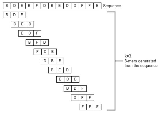 One of the significant drawbacks of OHE is the high dimensionality of the resulting set of feature vectors. Another problem with OHE is that some (sequential) ordering information on the sequence’s characters (amino acids) is not preserved. An approach that addresses both of these problems is to use sub-strings (also called mers) of length k, i.e., k-mers. From a sequence, k-mers are generated by applying a sliding window of size k over the sequences (see Figure 2). Given a sequence of length N, the total number of k-mers that could be generated is as follows: