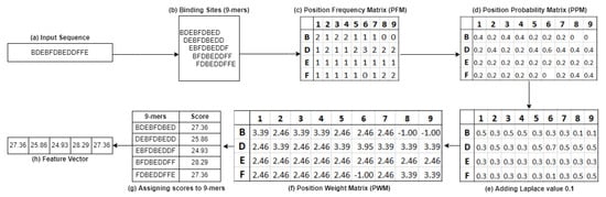 It is possible that the frequency (hence probability in the PPM) of a character at a certain position is 0. To avoid 0 values at any position in the matrix while calculating the probability, we added a Laplace estimator (also called pseudocount) to each value in the position probability matrix, as shown in Figure 3e. We used a pseudocount of 0.1 in our experiments [73]. We then computed a position weight matrix (PWM) from the adjusted probability matrix. We made the PWM by computing the log likelihood of each amino acid character c, i.e., , appearing at each position i according to