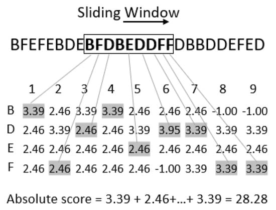 After getting the PWM, we used it to compute the absolute scores for each individual k-mer generated from the sequence (see Figure 3g for an example). It is the sum of the scores of the bases for the index. The score for k-mer (BFDBEDDFF) is shown in Figure 4. The highlighted values in the matrices are summed up to give an absolute score for the k-mer, which sums up to .