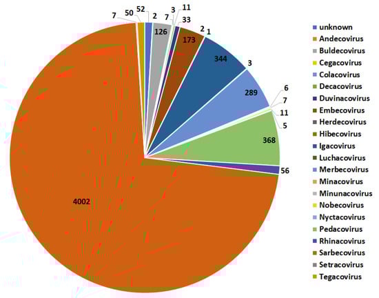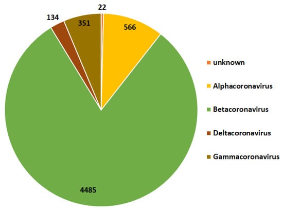 The spike protein sequences of CoVs for all hosts used in this analysis were retrieved (on 21 September 2021) from the NIAD Virus Pathogen Database and Analysis Resource (ViPR) [79] and GISAID [26]. A total of 5568 complete protein sequence were collected (3358 from ViPR and 2210 from GISAID); we later dropped 10 that were not attributable to any host detail. The distribution of the dataset across the different host types (grouped by family) is shown in Table 1, which contains information about the 21 host types that we collected from the annotation of the sequences. We also divided the viral sequences themselves into genera and subgenera to see which category a specific coronavirus belongs to. Figure 5 and Figure 6 contain distributions of viral genera and subgenera, respectively. The multiple sequence alignment (MSA) for the sequence dataset was conducted using the Mafft alignment software with default parameter settings which automatically select the appropriate strategy according to the sequence data size. In our case, the gap opening penalty op was 1.53 and the gap extension penalty ep was 0.123 [80]. Given that our dataset was already sufficiently large and contained a number of unknown or identified amino acids, we were constrained to use the minimum accuracy parameter of Mafft MSA to allow the alignment to complete in a reasonable amount of time. Attempts to set more stringent parameters (op and ep) in order to improve this alignment resulted in runtimes >24 h. Since this is already the case when performing multiple alignments of even 5000 sequences, anything substantially larger is out of reach.