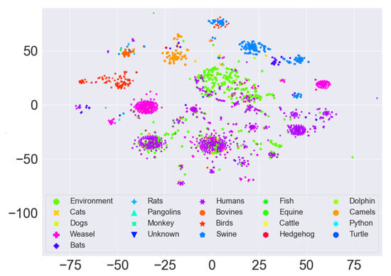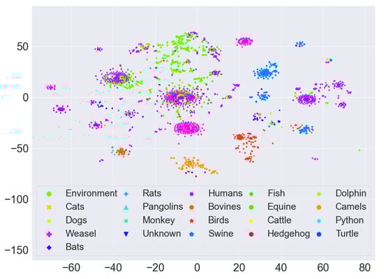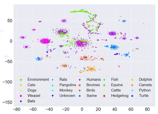 Monitoring zoonotic diseases and host specificity are integral to understanding disease dynamics. Sixty percent of known infectious diseases in humans and 75% of all emerging diseases are zoonotic, as reported by the United Nations Environment Program (UNEP) and the International Livestock Research Institute (ILRI) [13]. The study of the COVID-19 pandemic is of great significance, not only because it can help healthcare institutions to cope with the ongoing epidemic, but also because it allows researchers to learn more fundamentals about the family coronaviridae, which can provide new knowledge for the prevention of potential pandemics in the future. CoVs are widespread among birds and mammals and can be causes of zoonoses. A zoonosis is defined as any disease or infection that is naturally transmissible from vertebrate animals to humans by the World Health Organization, and COVID-19 has been classified as a zoonotic disease [14]. One important step to learning about zoonoses and understanding the current pandemic better is finding out how human infections began for SARS-CoV-2. CoVs can lead to various diseases in domestic animals, including dogs, swine, chickens, and cats. Although the origin of COVID-19 in humans is still unknown, genetic analysis results show that it is highly possible that SARS-CoV-2 originates from bats and utilizes the pangolin as an intermediate host [15,16,17].