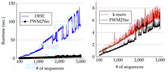 To evaluate the effect on runtime of the sequences, we used the best performing classifier (random forest) and used different embedding methods to perform classifications with increasing numbers of sequences. Figure 10 shows the runtimes for (a) OHE vs. PWM2Vec and (b) k-mers vs. PWM2Vec. In both cases, we can see that PWM2Vec is better in terms of runtime as we increase the number of sequences (on the x-axis).