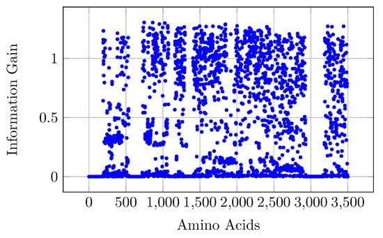 Machine learning algorithms require the input to be in a numerical format. It is necessary to process the (spike protein) sequence data into some numerical representation to apply these algorithms. One-hot embedding (OHE) [32] is a typical approach for obtaining a fixed-length numerical representation from sequence data. Considering an alphabet , which contains the characters (amino acids) of the spike protein sequence, we need to map each character of to a numerical (binary 0–1 vector) representation. We have 20 unique amino acids in the protein sequence data, namely, “ACDEFGHIKLMNPQRSTVWY.” We designed a feature vector for each amino acid. Each symbol has a length of 20 and has a value of 1 corresponding to the position of the character in the alphabet, and 0 for all other places in the alphabet. For example, amino acid Cysteine (C) is encoded as . We then concatenated the numerical representations of all characters of each protein sequence into a single binary feature vector of this spike sequence. In our coronavirus spike protein sequence dataset, after multiple alignments, the length of each spike sequence was found to be 3498. Therefore, the length of each binary vector computed using OHE would be 69,960.