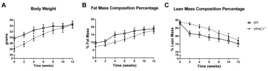 In this study, a 12-week phenotypic analysis of age-and sex-matched VPAC1−/− mice and WT littermates revealed no significant differences in body weight, and fat and lean mass composition (Figure 1). Even though a trend toward a greater body lean mass was observed in VPAC1−/− mice, those values were not significant at the end of the 12-week study (Figure 1C). In a previous study, VPAC1−/− mice were observed to have developmental delays with lower body weight, similarly to VIP null mice [28], with significantly lower body weights observed in 4-week-old VPAC1−/− male and female pups, compared to WT and heterozygous mice. In our laboratory, we have also observed lower body weights and higher mortality in VPAC1−/− pups (unpublished data), similarly to Fabricius et al. [8]. At the beginning of our study, VPAC1−/− mice at 8 weeks of age had body weight averages 3.4 g lower than WT littermates, yet not statistically significant, but after 12 weeks, VPAC1−/− and WT body weights were similar.