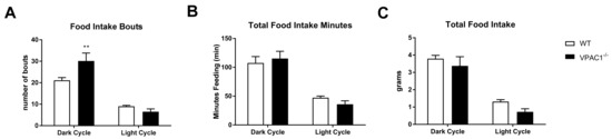 A 24-h analysis of food intake bouts (A), total food intake minutes (B), and total food intake grams (C) was conducted in VPAC1−/− and WT mice. Values were separated into dark (active) cycle and light (dormant) cycle. A two-factor ANOVA analysis was used to compare number of bouts, duration of bouts, and amount of food consumed. Values are means ± SEMs; ** p < 0.01.