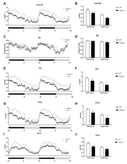 Analyses of respirometry and calorimetry data in VPAC1−/− and WT mice: TEE (A) and dark phase and light phase averages of TEE (B); RQ (C) and dark phase and light phase averages of RQ (D); VO2 (E) and dark phase and light phase averages of VO2 (F); VCO2 (G) and dark phase and light phase averages of VCO2 (H); VH2O (I) and dark phase and light phase averages of VH2O (J). A two-factor ANOVA analysis was used to compare TEE, RQ, VO2, VCO2, and VH2O dark phase and light phase averages. In panels B, D, F, H, and J, values are means ± SEMs; * p < 0.05.