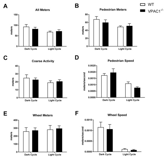 Analysis of physical activity and movement in WT mice and VPAC1−/− mice: All meters (total activity) dark phase and light phase averages (A); Pedestrian meters (mouse walking) dark phase and light phase averages (B); Course activity (mouse movement) dark phase and light phase averages (C); Pedestrian speed (mouse speed) dark phase and light phase averages (D); Wheel meters (rotation) dark phase and light phase averages (E); Wheel speed (rotation speed) dark phase and light phase averages (F). A two-factor ANOVA analysis was used to compare these dark phase and light phase averages. Values in panels A through F are means ± SEMs.