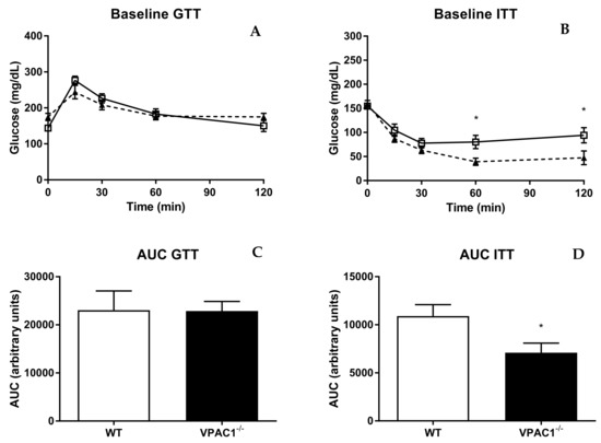 Glucose tolerance test (GTT) and insulin tolerance test (ITT) in WT (open square) and VPAC1−/− mice (closed triangle). Blood glucose values (A,C) and area under the curve (AUC) of glycemia analysis (B,D) of blood glucose levels. An unpaired t-test was used to compare time points post glucose/insulin infusion in WT mice and VPAC1−/− mice. A two-factor ANOVA analysis was used to compare AUC values between WT and VPAC1−/− mice. Values are means ± SEMs; * p < 0.05.