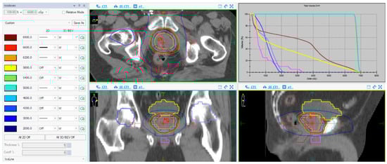 Dose-volume histogram (upper-right image); a blue line represents the PTV coverage, brown and yellow lines represent the dose received by the rectum and bladder, respectively. CT images of volumes and isodose distribution of a VMAT plan in the axial, coronal and sagittal planes (the rest of images); a blue line represents PTV margin. Treatment plan showing the radiation dose distribution in colored, lines within the interval from 30 Gy (dark blue) to 66 Gy (red).