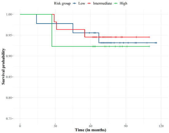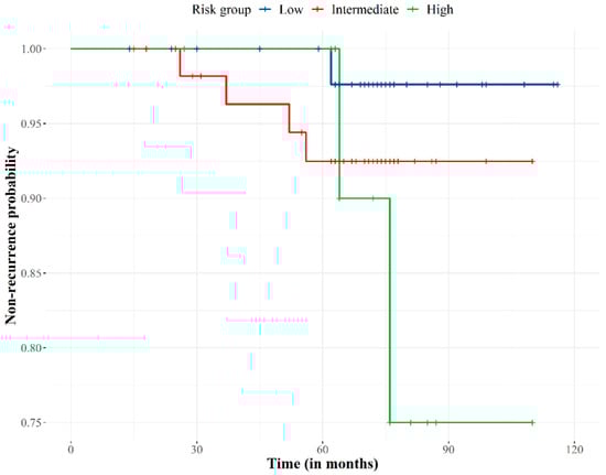 Biochemical failure-free curve according to prostate cancer recurrence risk group. Non-recurrence probability slightly decreased over 28 months of follow-up, progressively decreased to 75 months when the probability stabilized at 92%. The risk of recurrence became extreme for the high-risk group at 75 months of follow-up.
