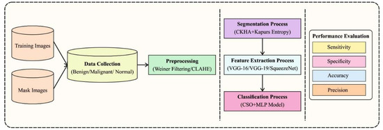 The current study developed a novel EDLCDS-BCDC technique to identify the existence of breast cancer using USIs. In this technique, the pre-processing of USIs primarily occurs in two stages, namely noise elimination and contrast enhancement. Subsequently, CKHA-KE-based image segmentation with ensemble DL-based feature extraction processes are performed. Finally, CSO-MLP model is utilized to classify the images in terms of whether breast cancer exists or not. Figure 1 illustrates the overall process of the EDLCDS-BCDC technique.