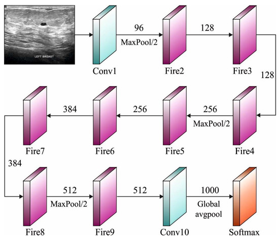 The primary objective of SqueezeNet is to achieve high accuracy using less parameters. To accomplish this objective, three processes are used. Primarily, a 3 3 filter is substituted by a 1 × 1 filter with less parameters. Next, the input channel count can be minimized to 3 × 3 filters. At last, the subsampled operation is carried out at the final stages to create a convolutional layer with a large activation function. SqueezeNet is mainly based on the concept of an Inception module [22] to design a Fire module with a squeeze layer and an expansion layer. The fire module comprises a squeeze convolution layer (which has only 1 × 1 filters) that feeds into an expansion layer with a mix of 1 × 1 and 3 × 3 convolutional filters.