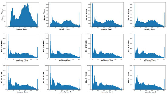 represents the number of pixels with gray values, represented by , and denotes the number of pixels in an image. Equation (1) is adapted easily to find a multiple-threshold value that separates the image into homogenous regions, where it can be redeveloped. Consider a gray image with an intensity value within , then the algorithmic search for finding the optimum threshold value that subdivides the image to to maximize the subsequent function is as follows: