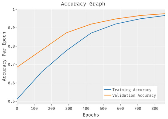 The results from the accuracy analysis of the EDLCDS-BCDC technique conducted on the test data are illustrated in Figure 6. The results demonstrate that the proposed EDLCDS-BCDC system accomplished an improved validation accuracy as compared to the training accuracy. Further, the accuracy values were also found to be saturated with the number of epochs.