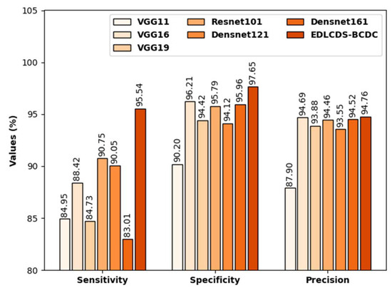Figure 9 contains the comparative analysis results, in terms of , , and , for the proposed EDLCDS-BCDC technique as well as other recent approaches [25]. The results indicate that the VGG19 and Densnet161 models obtained the lowest values of , , and .