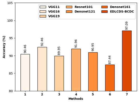 Figure 10 highlights the comparative analysis results, in terms of , accomplished by EDLCDS-BCDC and recent approaches [25]. The results indicate that both the VGG19 and Densnet161 models obtained low . In addition, the VGG11, Resnet101, and Densenet161 models produced slightly increased values. Moreover, the VGG16 model accomplished a reasonable of 92.46%. However, the proposed EDLCDS-BCDC technique surpassed all other available methods with the highest of 97.09%.