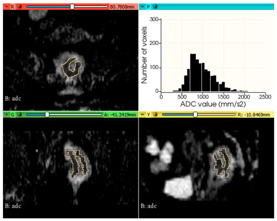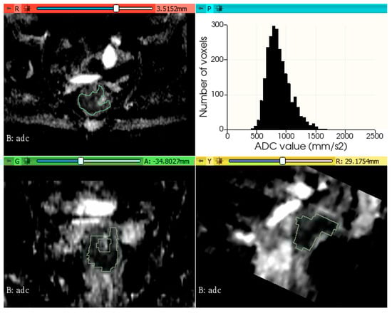 The histogram plots of ADC values were generated using a python code, provided in Supplementary File S1. Figure 2 and Figure 3 show two examples of tumor segmentation and histogram plots, representative for each subgroup of patients.