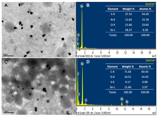 Selenium nanoparticles produced by Pantoea agglomerans UC-32 strain without functionalization (Se0Nps) and after L-cysteine functionalization (Se0Nps/L-Cys). (A) TEM micrograph of Se0Nps among P. agglomerans UC-32 cell debris; (B) SEM-EDS data obtained from Se0Nps; (C) TEM micrograph of Se0Nps/L-Cys among P. agglomerans UC-32 cell debris; (D) SEM-EDS data obtained from Se0Nps/L-Cys.