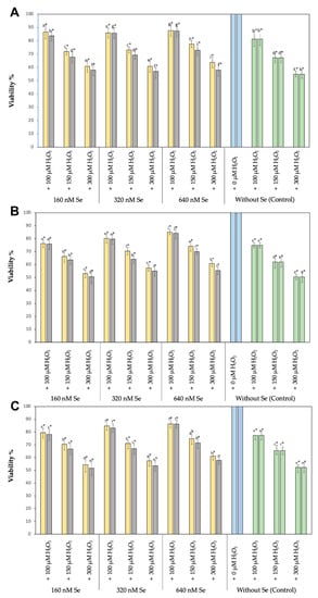 RTS-11, RTgill-W1, and T-PHKM cells cultured in the presence of 160, 320, or 640 nM Se0Nps/L-Cys or Na2SeO3 and then subjected to 100, 150, or 300 µM H2O2 showed to better retain their viability when compared to the positive controls in a dose dependent manner, being the best cell viabilities obtained in the cultures containing 640 nM Se0Nps/L-Cys or Na2SeO3. Similarly, as observed in the positive controls, RTS-11 cells showed better viabilities when compared to RTgill-W1 or T-PHKM at all Se0Nps/L-Cys or Na2SeO3 concentrations. RT-gill-W1 was the cell type showing the lowest cell viabilities. Cell viabilities in all experimental groups were significantly less (p < 0.05) than those of the negative controls and significantly better (p < 0.05) than those of positive controls (Figure 2).