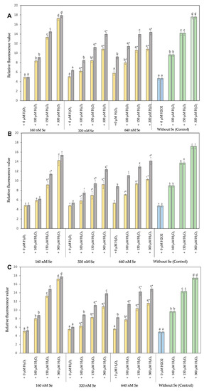 The effect of Se0Nps/L-Cys against H2O2-induced toxicity was evaluated in RTgill-W1, RTS11, and T-PHKM cells measuring cellular ROS concentration according to Singh et al. [38]. Briefly, RTgill-W1 cells (4 × 104 cells), RTS-11 cells (5 × 104 cells) or T-PHKM cells (5 × 104 cells) in 100 µL L-15 Leibovitz’s medium were placed in each well of 96-well flat bottom microplates (Merck, Darmstadt, Germany) and cultured at 20 °C with Se0Nps/L-Cys or Na2SeO3 (160, 320 or 640 nM) for 24 h. Then, L-15 Leibovitz’s medium was carefully extracted and replaced with fresh medium containing 100, 150, or 300 μM hydrogen peroxide (H2O2) as a cellular ROS-inducing agent [39] at 20 °C during 24 h. According to Kling and Olsson [40], H2O2 concentrations chosen were non-lethal for rainbow trout cell lines. After this incubation period, 1 µM of the fluorescent probe 6-carboxy-2′,7′-diclorodihidrofluroresceine diacetate (Carboxy-DCFH-DA) (Molecular Probes/Invitrogen, Waltham, MA, USA) was added and cultures maintained at 20 °C in the dark for additional 30 min. The oxidation of carboxy-DCFH into highly fluorescent 2′,7′-dichlorofluorescein (DCF) by intracellular ROS was evaluated by the fluorescent absorbance value using a microplate reader PR 4100 TSC (Bio-Rad, Hercules, CA, USA). Cells were sampled and fluorescence was measured according to Chen et al. [41]. The ROS effects on cell viability of RTgill-W1, RTS11, and T-PHKM cells were also determined using the same procedure described in Section 2.4.2. The assays were carried out in triplicate.