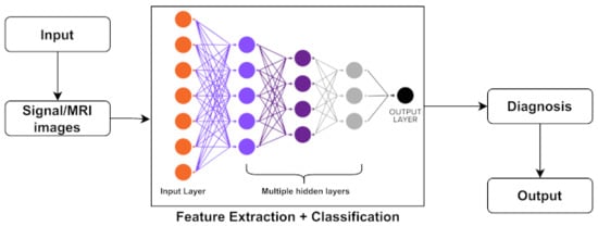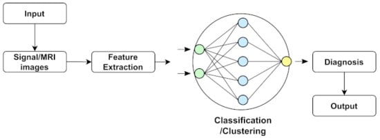 Neurological diseases (NDs) are a fragment of human disorders that identify complications of the brain. Neurological illnesses, often known as brain, behavioral, or cognitive disorders, affect people’s abilities to walk, speak, learn, and move [2]. As the brain is the control center of the human nerves, affecting the brain can threaten one’s life. Awareness of these diseases has lessened the mortality rate; however, some chronic NDs can cause permanent and partial disability or suffering. The global prevalence of these disorders accounted for 10.2% of the cases. Furthermore, these illnesses have a high causality rate of 16.8 % per year, respectively. These percentages indicate that neurological and neuropsychiatric disorders have higher disability rates than other human disorders [3]. In addition, the diagnosis of neurological illnesses is a developing problem and one of the most complex challenges. For the identification, monitoring, and treatment of neurological diseases, current diagnosis technologies, reviewed in Section 4, produce massive amounts of data. Experts generally perform a manual analysis of big medical data to find and comprehend problems. Recently, an advanced notion of an automated computer-aided diagnosis (CAD) [4] system for experts or neurologists to detect neurological disorders from big medical data has been proposed. The algorithms of significant CAD systems are built using pattern recognition techniques and theories, and consequently, CAD is considered one of the pattern recognition domains [5]. The techniques used by CAD systems are illustrated in Figure 1, and include data pre-processing, feature extraction, and classification. The CAD solutions assist specialists in effectively evaluating big medical data, improving diagnosis accuracy and consistency while reducing analysis time. The CAD system is cost-effective and efficient, and it may be utilized by professionals in the diagnosis and treatment of neurological illnesses as a decision support system. The acquired medical data (e.g., medical image data or medical signal data) were processed during the pre-processing period to remove noise and reduce the complexity and computation time of CAD algorithms. One of the essential elements of the CAD system is the feature extraction section, which extracts disease bio-markers from the source data. The extracted feature vectors are utilized as input in the classifier model for allocating the candidate to one of the available categories (e.g., healthy or normal) based on the output of a classifier in the classification process for CAD systems [6].