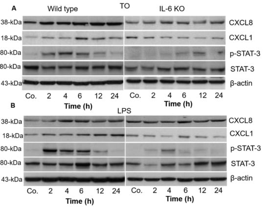 Western blot analyses of proteins from mouse livers with antibodies against chemokines and STAT-3 in wild-type and IL6-KO mice after TO (A) and LPS injection (B). β-actin served as a loading control. Quantification of p-STAT-3 was performed by densitometric analysis after TO (C) and LPS injection (D) in WT and IL6-KO mice. The data were normalized with the loading control from the same lane. Saline-treated animals served as controls (Co.). Both treated and control animals were sacrificed at 2, 4, 6, 12, and 24 h after injection (n = 3). Significance was accepted at * p ≤ 0.05, and ** p ≤ 0.01. Figures S1 and S2, The complete WB diagram is shown in the supplement materials.