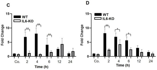 RT-PCR analysis of total liver RNA from WT- and IL6-KO mice after LPS injection intraperitoneally with a concentration of 2 mg/kg dissolved in 100 µL saline. Saline-treated animals (100 µL i.p.) served as controls (co). Both the treated and control animals were sacrificed at 2, 4, 6, 12, and 24 h after injection. The controls were set as 1. Fold-changes of mRNA expression of CXCL1 and CXCL2, CXCL5, CXCL8, CXCL10, and CCL2 are presented. Results represent the mean ± SEM values compared with the saline-treated controls for each time point (analyzed by one-way ANOVA analysis of variance, n = 6). Significance was accepted at ** p ≤ 0.01.