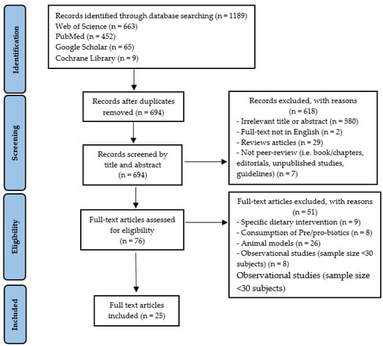 At the end of the selection process, 1189 articles were extracted, of which n = 663 from Web of Science, n = 452 from PubMed, n = 65 from Google Scholar, and n = 9 from Cochrane Library. Each title and abstract were screened for relevance, removing review articles, unpublished studies, meta-analyses, practical guidelines, books and book chapters, editorials, letters to the editor and essays (n = 618). Thereafter, the search strategy was based on the assessment of the full text of the remaining 76 articles to verify their eligibility. Lastly, 25 research articles specifically focusing on GM responses to PA/PE, in healthy and unhealthy participants, were included (Figure 1).