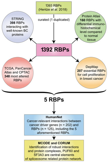 RNA-binding proteins (RBPs) are particularly relevant due to their implication in every post-transcriptional step of gene expression: RNA splicing, transport, stability, translation, and localization. As a result, genomic alterations of these proteins lead to dysfunctional cellular processes, but only a few have defined functions in BC [18,19,20,21,22,23,24,25]. To date, 1393 RBPs have been experimentally identified in the human RNA interactome [26]. Despite efforts to understand their role in cancer [27,28], an integrated analysis of the aforementioned databases along with other in silico approaches is still missing for BC. To shed light on this matter, we analyzed and integrated RBPs genomic alterations, protein–protein interaction (PPI) networks, immunohistochemical profiles, and loss-of-function experiments to find new putative breast cancer RNA-binding proteins.