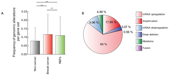 Genomic alterations of RBPs in BC. (A) Frequency of genomic alterations per gene set (non-cancer genes (n = 170), BC genes (n = 171), and RBPs [n = 1392]) using the Breast Invasive Carcinoma (TCGA, PanCancer Atlas) and Breast Cancer (CPTAC) database [5,6,7,8,9,10,35]. Genomic alterations per patient were corrected by the number of genes; a Mann–Whitney U test was used to compare genomic alterations between gene sets. ** = very significant difference; ns = not significant. (B) A pie chart describing RBPs’ genomic alteration types.