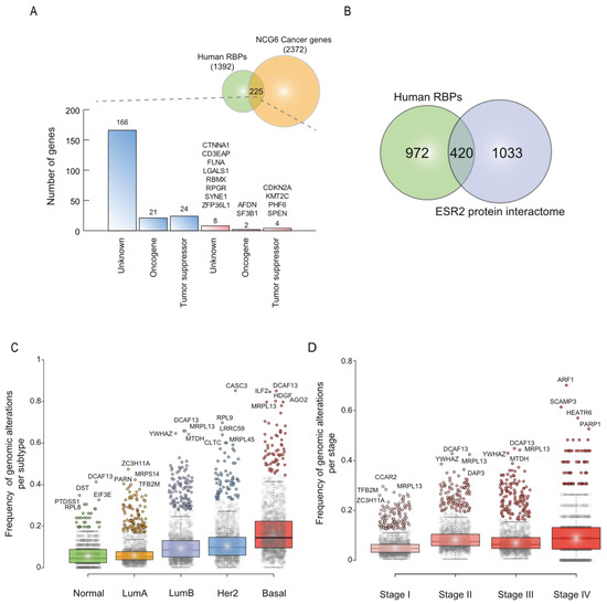 Identification of highly altered breast cancer RNA-binding proteins. (A) A histogram describing the status of RBPs in the Network of Cancer Genes 6.0 (NCG6). In blue, RBP status in other cancer types; in red, breast cancer RBPs. (B) A Venn diagram depicting the relationship between RBPs and ESR2 protein interactomes. RBPs genomic alterations per subtype (C) and stage (D), using the Breast Invasive Carcinoma (TCGA, PanCancer Atlas) and Breast Cancer (CPTAC) [5,6,7,8,9,10,35] database, are displayed. Genomic alterations per subtype and per stage were corrected by the number of patients; a Mann–Whitney U test was used to compare genomic alterations between sets. All possible comparisons between sets present significant differences (p < 0.001) except Normal vs. Lum A subtypes; ns = not significant.