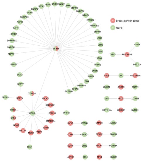 Experimental protein–protein interactions between RNA-binding proteins and well-known breast cancer proteins. An interaction network, constructed using STRING database and the Cytoscape 3.7.1 platform, is presented: red, BC proteins; green, RBPs.