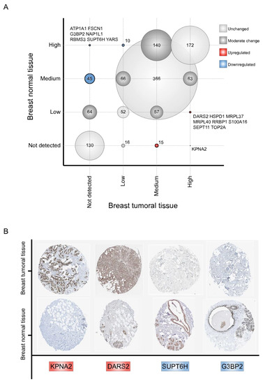 Immunohistological levels of 1212 available RBPs in normal and BC tissues were extracted from Protein Atlas version 18.1 (https://www.proteinatlas.org (accessed on 15 June 2021)) [14,15,16]. Expression levels of normal tissues were taken from glandular cells, while a consensus level was manually generated for BC tissues (Table S7) based on tissue level frequency. Immunohistological images were taken from https://www.proteinatlas.org/ENSG00000182481-KPNA2/tissue/breast#img (accessed on 15 June 2021) (KPNA2 staining of normal tissue), https://www.proteinatlas.org/ENSG00000182481-KPNA2/pathology/tissue/breast+cancer#img (accessed on 15 June 2021) (KPNA2 staining in tumoral tissue), https://www.proteinatlas.org/ENSG00000138757-G3BP2/tissue/breast#img (accessed on 15 June 2021) (G3BP2 staining in normal tissue), https://www.proteinatlas.org/ENSG00000138757-G3BP2/pathology/breast+cancer#img (accessed on 15 June 2021) (G3BP2 staining in tumoral tissue), https://www.proteinatlas.org/ENSG00000109111-SUPT6H/tissue/breast#img (accessed on 15 June 2021) (SUPT6H staining in normal tissue), and https://www.proteinatlas.org/ENSG00000138757-G3BP2/pathology/breast+cancer#img (accessed on 15 June 2021) (SUPT6H staining in tumoral tissue).