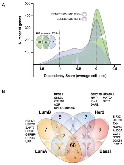 Most RBPs present numerous genomic alterations (Figure 2 and Figure 3C,D; Tables S2–S4), making it difficult to detect essential RBPs for cell proliferation and/or survival, i.e., breast cancer RBPs dependencies. Thus, we analyzed 1288 available RBPs on CERES [11] and 1290 available RBPs on DEMETER2 [12,13] through the DepMap portal (https://depmap.org/portal (accessed on 20 June 2021)). Both initiatives report loss-of-function screens performed in several human cancer cell lines [11,12,13].
