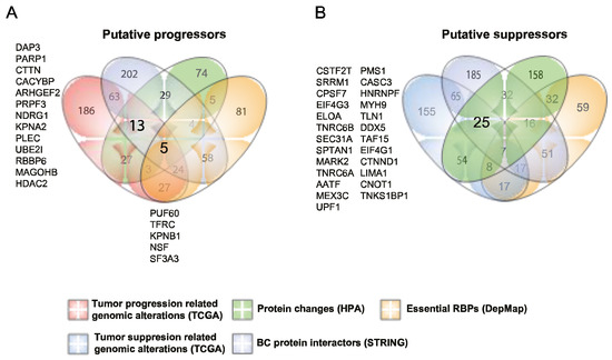 Detecting putative breast cancer RNA-binding proteins. (A) A Venn diagram depicting the number of unique and shared RBPs across the four cancer-progression profiles. (B) A Venn diagram showing the number of unique and shared RBPs across the four cancer-suppression profiles.
