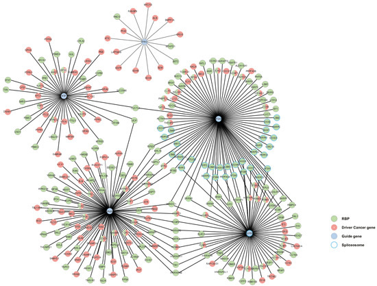 To better understand the cellular functions of these prioritized RBPs (TFRC, KPNB1, PUF60, NSF, and SF3A3) in cancer, we next interrogated the HumanNet v2 [81,82]. This tool allowed us to integrate these five RBPs into a disease gene network. We first obtained an initial network of 2231 interactions (Table S11). To narrow down the analysis to cancer-relevant interactions, we then filtered the network by CDGs (n = 202 genes) and RBPs (n = 125 genes) and used MCODE [41] to find protein complexes within the network; the largest one and more relevant was formed by 36 nodes and 591 edges. The CORUM [42] database identified 34 of these 36 proteins as a part of the spliceosome complex where PUF60 and SF3A3 are central elements interacting with several RBPs and the cancer driver gene (Figure 8).