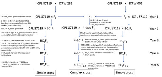 With a view to combining different components governing pod borer resistance into a common genetic background, we also developed two backcross populations (four-way BC1F2) derived from complex four-way F1 crosses in two different genetic backgrounds, ICPL 87119 ((ICPL 87119 × ICPW 1) × (ICPL 87119 × ICPW 281)), and ICP 8863 ((ICP 8863 × ICPW 1) × (ICP 8863 × ICPW 281)). To generate a complex cross population in the ICPL 87119 background, sterile and semi-sterile F1 plants from the ICPL 87119 × ICPW 1 cross were crossed with fertile F1 plants from the ICPL 87119 × ICPW 281 cross. These four-way F1 plants were further crossed with ICPL 87119 to generate BC1F1 seeds, designated as 4-BC1F1. A similar approach was followed to generate 4-BC1F1 seeds in the ICP 8863 background. True 4-BC1F1 plants were selfed twice to produce 4-BC1F3 populations from both crosses. The pre-breeding population derived from the cross ((ICPL 87119 × ICPW 1) × (ICPL 87119 × ICPW 281)) consisting of 533 ILs was designated as PP 1503; and that derived from the cross ((ICP 8863 × ICPW 1) × (ICP 8863 × ICPW 281)) consisting of 392 ILs was designated as PP 1504 (Table 1; Figure 1).