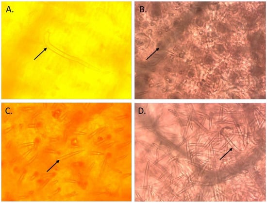 On the basis of the performance of selected ILs during the 2019 rainy season, the most promising 39 pod borer resistant ILs were selected for further analysis in a trial in the 2020 rainy season. The trichome density on the leaves of these 39 ILs was recorded by observing a minimum of three uniformly developed leaves from each accession. Each IL was analyzed with three replications. The leaf samples were immersed in an acetic acid and ethanol mixture (2:1) in stoppered 10 mL glass vials for 24 h to remove chlorophyll, and subsequently transferred into lactic acid (90% v/v) as a preservative. The calyxes and the pods were examined at 10× magnification under a stereomicroscope (Carl Zeiss, Inc., Thornwood, NY, USA) equipped with an ocular measuring grid. The number of different types of trichomes (types A, B, C, and D; Figure 2) and their density (mm2) within the microscopic field were recorded [4,7].
