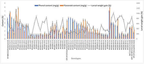 Total phenols and flavonoids concentrations in seeds and larval weight gain in selected ILs, and their cultivated recurrent parents and checks. Evaluations were conducted during the 2019 rainy season at ICRISAT, Patancheru, India. Error bars indicate standard error of the mean.