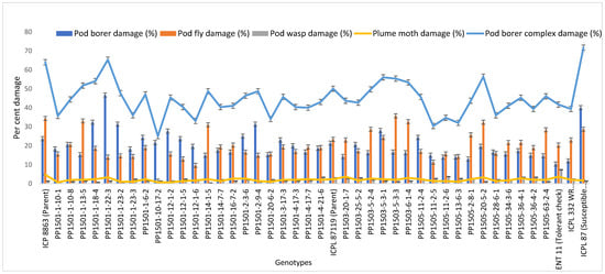 The pod fly (M. obtusa) damage ranged from 3% to 55%. The lowest pod fly damage was recorded in PP1501-9-18-1 (3%) followed by PP1501-1-13-5, PP1501-1-23-2 (10%), PP1501-1-22-5 (12%), PP1501-2-6-2, PP1501-10-17-1, and PP1501-10-17-2 (13%), and PP1501-1-5-2, PP1501-2-16-4, PP1501-4-21-6 and PP1501-12-1-2 (all 14%). The level of pod fly damage varied among the cultivated recurrent parent ICP 8863 (38%) and the checks ENT 11 (30%), ICPL 332WR (34%), ICPL 87119 (40%), and ICPL 87 (44%). Apart from pod borer and pod fly, pod wasp and plume moth also caused a small amount of damage (Table 2, Supplementary Table S1).