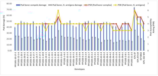 The damage caused by the total pod borer complex ranged from 32% to 78%. The lowest pod borer complex damage was recorded in PP1501-2-3-6 (32%) followed by PP1501-1-22-3 and PP1501-3-17-3 (33%), which was lower than in the cultivated recurrent parents, ICP 8863 (42%) and ICPL 87119 (46%), and the checks, ENT 11 (50%), ICPL 332WR (44%), and ICPL 87 (70%) (Table 3). The highest pod borer complex damage was observed in PP1503-29-2-1 (78%) (p ≤ 0.001; Supplementary Table S5).