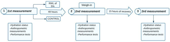 The current study aimed to simulate a real competition environment to test our hypothesis. Therefore, the athletes from both RWL and control groups participated in 3 measurements: anthropometry, hydration status and performance tests. The first measurement was made 48 h before reference weigh-in time (at 19:00), the same time the official weigh-in is held during official competitions. The second measurement was carried out after 48 h at 19:00 (the same as official weight-in time), during which RWL group athletes had to meet the study’s criteria of losing 5% of their body mass. Finally, the next day, the third measurement was made after 15 h of recovery (RWG) at 10:00–11:00, where the athletes of the RWL group were instructed not to gain more than 5% of their body mass. This simulated the competition environment and the official weigh-in procedures under the current IJF Refereeing Rules [1]. All athletes were instructed to refrain from caffeine and alcohol 24 h before the measurements. In addition, they were instructed to come to the baseline evaluation in a well-fed and hydrated state. Following the first evaluation, control athletes kept their routine, i.e., food and fluid intake, in the 48 h before the second measurement. RWL athletes were supposed to lose 5% of their body mass during 48 h using their usual methods to cut weight. However, they were also warned against the usage of laxatives, diuretics and diet pills. After the second measurement, athletes were instructed to maintain the same food and fluid intake as they do before competitions. RWL group was also instructed not to gain more than 5% of their body mass during the recovery following second body mass measurement according to the IJF weigh-in rule [1], which disqualifies athletes from the competition. For assessing judo performance, a special judo fitness test (SJFT) was applied in baseline measurements, at weight in (after 48 h) and after the 15 h recovery period. The SJFT was applied three times in each performance evaluation with 10 min breaks between them. The 10 min breaks also simulated the minimum official competition break that an athlete is entitled to before the next fight under the current IJF rules [1].