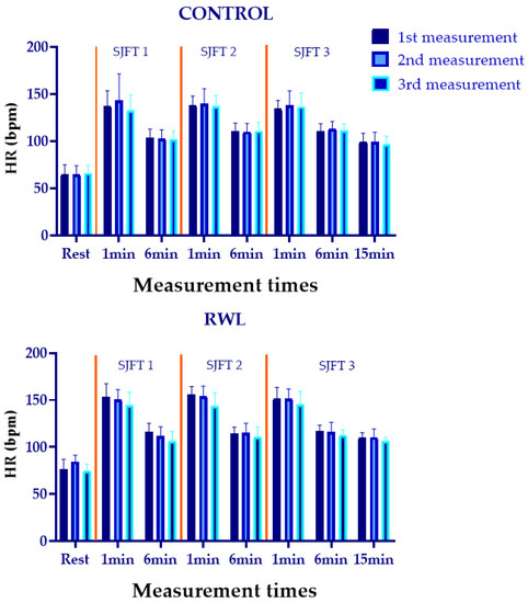 Following RWL, a significant difference was found in HR values between RWL and control groups. RWL group presented higher HR values 1 min after the second SJFT compared to the control group (control = 143 bpm vs. RWL = 150 bpm, p = 0.04). RWL group also presented higher values 1 min after the third SJFT performance (control = 137 bpm vs. RWL = 151 bpm, p = 0.03). HR changes can be found in Figure 3.