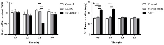 HC-030031, a TRPA1 selective antagonist, inhibited TRPA1 activity in vivo and in vitro [33] (Aladdin, Shanghai, China), dimethyl sulfoxide (DMSO) (Aladdin, Shanghai, China), stroke-physiological saline solution for marine animals (2% sodium chloride solution; Leagene, Beijing, China), and 5-HT (Sigma-Aldrich, Shanghai, China), were used in this study. HC-030031 and 5-HT were dissolved in 10% DMSO in distilled water and stroke-physiological saline solution for marine animals (marine saline), respectively. The dosage of chemicals in experiments 2, 3 and 4 were as follows: HC-030031 (2.5 mg/mL, 40 μL/ind); 10% DMSO (40 μL/ind); 5-HT (25 μg/g ind−1, the solution volume depended on the body weight of different individuals) [29]; marine saline (the same solution volume as 5-HT/ind). According to our preliminary experiment, the most effective drug durations were 2–3.5 h (df1 = 2, df2 = 12, F = 35.518, p < 0.001, Figure 2A) for HC-030031 and 0–0.5 h for 5-HT (df1 = 2, df2 = 12, F = 129.133, p < 0.001, Figure 2B) after injection for HC-030031 and 5-HT, respectively. For experiments 2, 3 and 4, all chemicals were injected into the peristomial membrane of S. intermedius [34] by using micro sampling syringes. To avoid cross-contamination, each chemical corresponded to its own individual syringe.