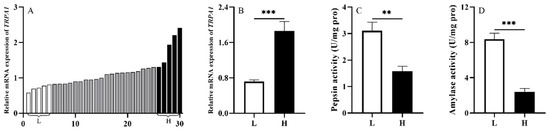 To investigate whether TRPA1 is involved in the food digestion of S. intermedius, we randomly selected 30 sea urchins from the laboratory tank (1000 L) under the natural culture condition and measured TRPA1 expression level of their guts. Subsequently, we ranked the expression levels of TRPA1 of the 30 sea urchins, and compared the 5 sea urchins with the highest expression levels of TRPA1 (named as group H) with the 5 with the lowest expression levels of TRPA1 (named as group L). Then, we measured the pepsin and amylase enzyme activities of intestinal samples with the corresponding groups H and L. The expression of TRPA1 in the guts of 30 sea urchins was ranked from low to high (from left to right) (n = 30, Figure 3A).