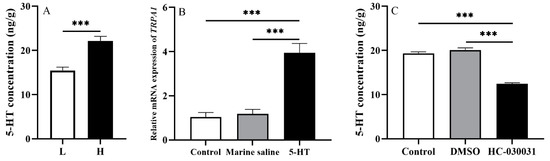 An inter-regulatory relationship between TRPA1 and 5-HT in the gut of Strongylocentrotus intermedius. (A) The 5-HT level in the gut of groups L and H (n = 5). (B) TRPA1 expression after the 5-HT injection (n = 5). (C) The 5-HT level after the HC-030031 injection (n = 5). The symbol *** means p < 0.001, (mean ± s.e.m.).