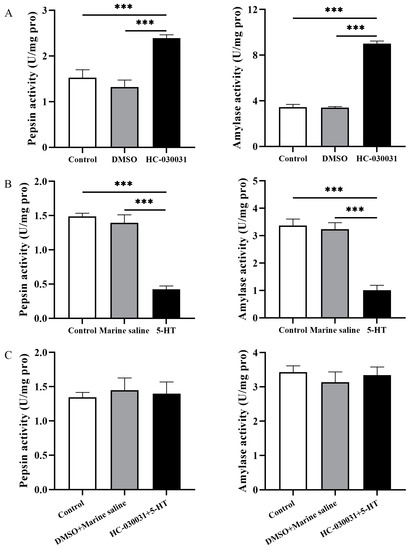 Finally, sea urchins were injected with HC-030031, and then injected with 5-HT 3 h after the HC-030031 injection. After 3.5 h of the HC-030031 injection and 0.5 h of the 5-HT injection, sea urchins of the experimental group (named as HC-030031 + 5-HT group) were individually measured for their pepsin and amylase enzyme activities. DMSO + marine saline group was established as the vehicle control group accordingly. Untreated sea urchins (without any chemical administration) were used as control group. There were no significant difference of pepsin and amylase activities among the control, DMSO + marine saline, and HC-030031 + 5-HT groups (pepsin: df1 = 2, df2 = 12, F = 0.118, both p > 0.05; amylase: df1 = 2, df2 = 12, F = 0.364, both p > 0.05, Figure 5C).